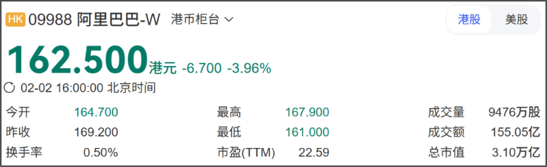 资本市场上,截至2月2日下午四点,阿里巴巴港股(09988)下跌约3.96%。