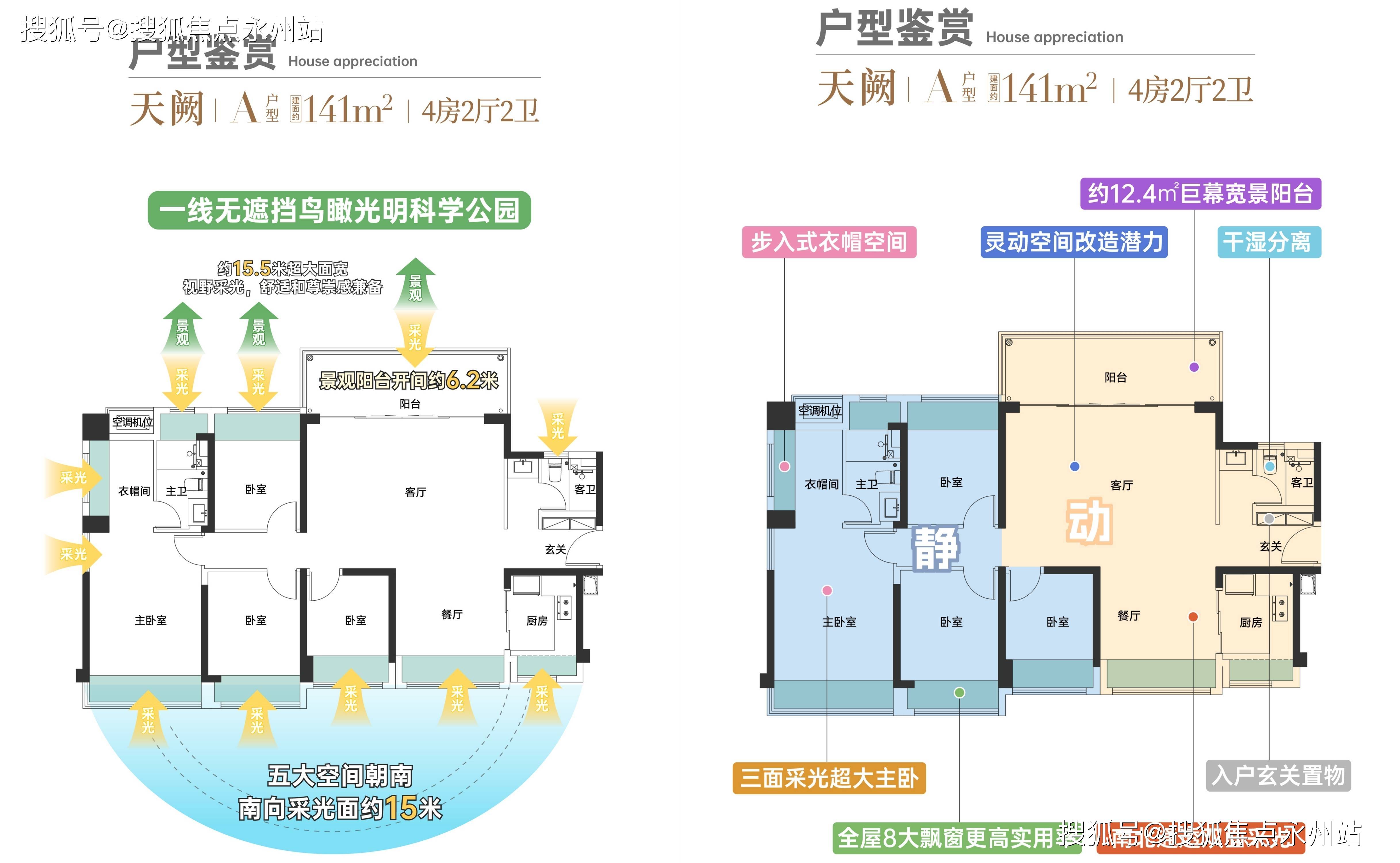 141㎡的4房2厅2卫,设计的是横厅南北通透格局,进门入户玄关,超宽客厅6.2米的开间,五开间朝南,4个卧室分别做到了主卧19.62㎡/次卧12.45㎡/次卧10.36㎡/次卧9.04㎡(包含墙体飘窗),主卧大套房设计,U型厨房,公卫三段式分离设计,得房率约:81.4%(不含赠送),阳台主朝东北向,看科学公园景观。