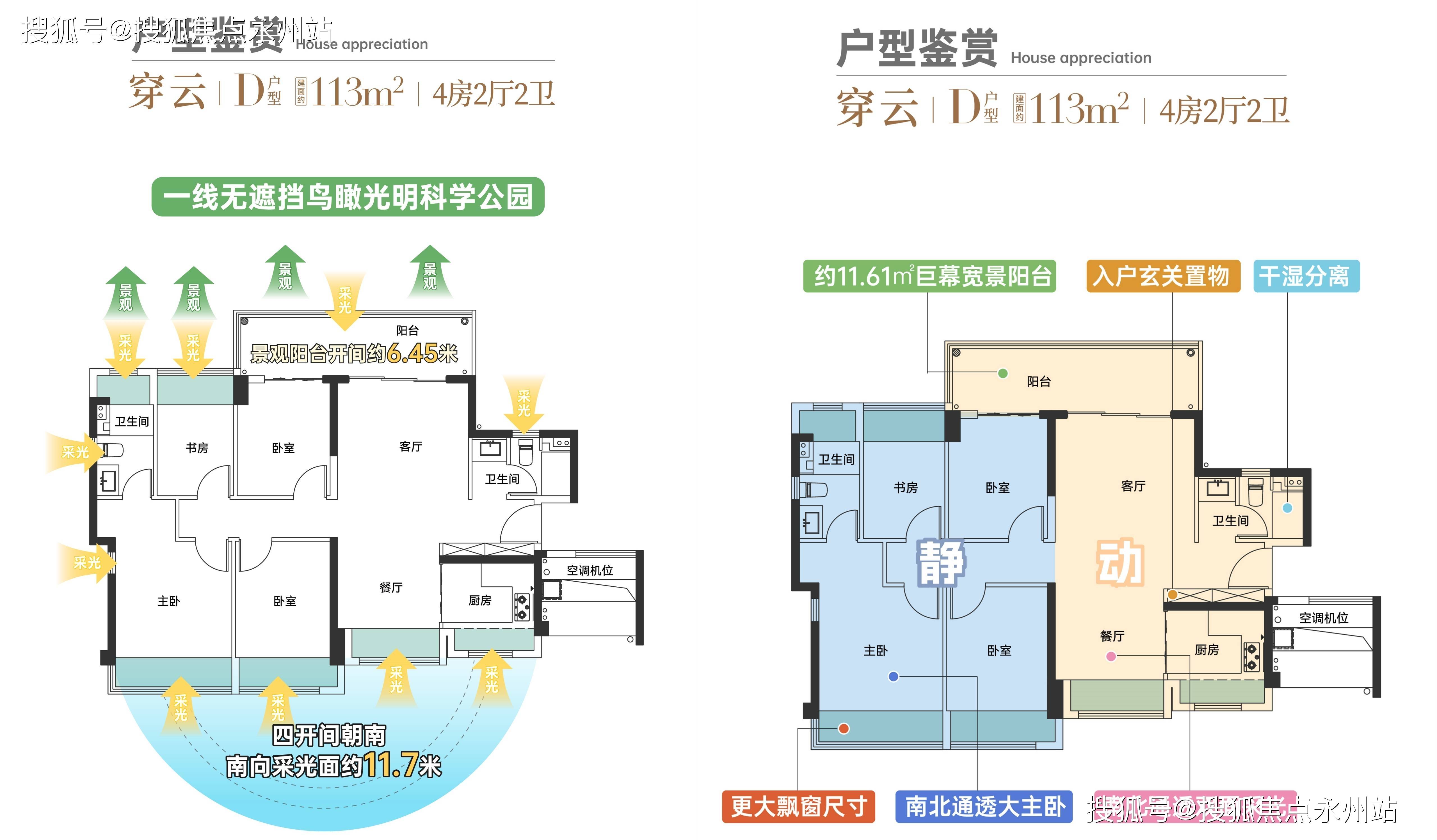 113㎡的4房2厅2卫,设计的是竖厅南北通透格局,进门入户玄关,客厅连接次卧出6.45米长的大阳台,四开间朝南,4个卧室分别做到了主卧18.62㎡/次卧11.07㎡/次卧9.31㎡/次卧7.93㎡(包含墙体飘窗),主卧大套房设计,U型厨房,公卫三段式分离设计,得房率约:81.78%(不含赠送),阳台主朝东北向,看科学公园景观。